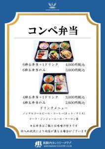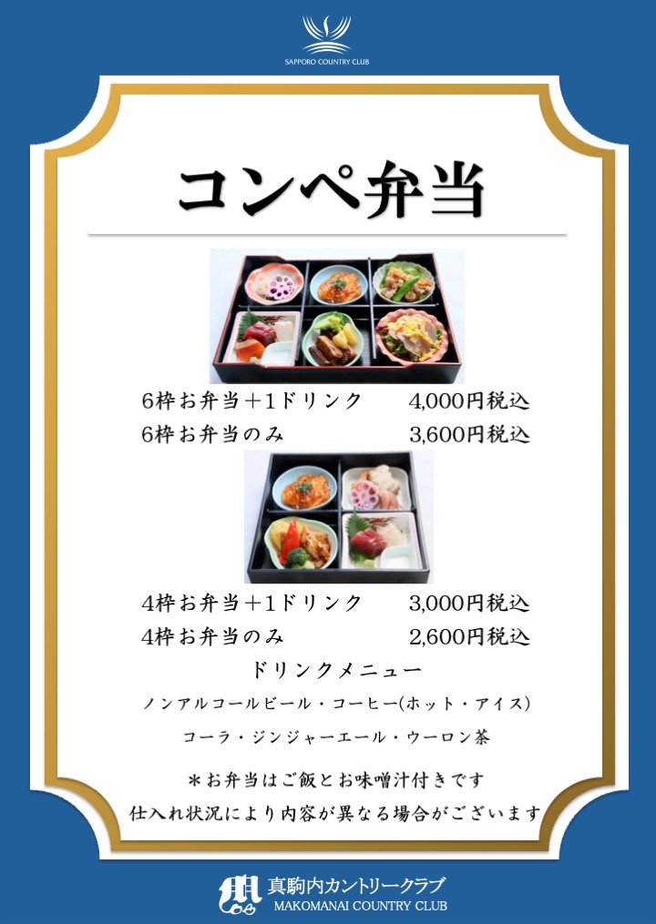真駒内CC コンペお弁当のご案内 2026.04.25 コンペ幹事様 コンペお弁当のご案内です。 お弁当各種ご用意ございます。 また、その他ご希望によりご提案も可能でございます。 お問い合わせは、真駒内カントリークラブもしくは予約センターまで 一覧に戻る 前の記事へ